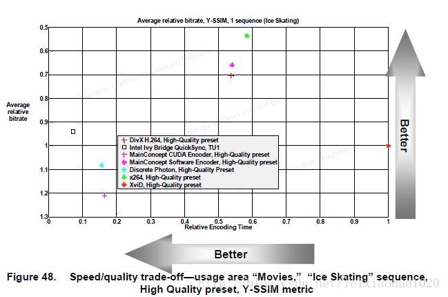 一般情况下,编码速度越快,编码的质量就会差一些;编码对质量的要求较高,那么编码的速度就会慢很多。这就是所谓的“鱼和熊掌不可兼得”了。于是就有了速度/质量权衡的图表。在这张图表中,横坐标代表相对的编码时间,取值越小越好。纵坐标代表相同视频质量的时候编码器使用的相对码率。在这里MSU使用XviD作为参考编码器。即XviD在这张表的横坐标和纵坐标都是1,即位于(1,1)点。可以看出,X264是编码慢,质量最好。Intel Ivy Bridge QuickSync是编码最快,质量稍差。