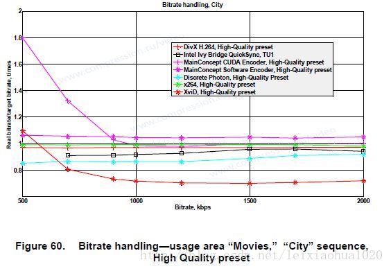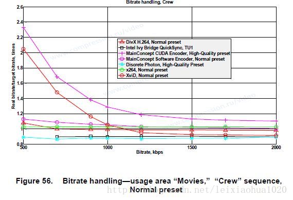 这张图表用于测试编码器的码率控制性能。码率控制性能好的编码器,编码后输出的视频码率和编码前设定的码率相同。码率控制性能差的编码器,编码后输出的视频码率和编码前设定的码率差别会很大。图表中纵坐标是实际码率与设定码率的比值。这个值为1,代表码率控制准确。横坐标是码率。从图中可以看出XviD在码率大于800kbps之后,出现码率控制不准的情况。Discrete Photon在码率小于500kbps的时候也出现不准的情况。其他编码器码率控制都很准确。
