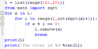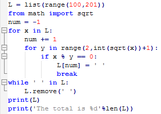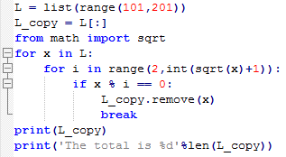 原因:Python中for循环是根据下标的,上述方法中,当remove(104)后,原本{104}所属的索引位4被空缺,接由后面的{105}取代索引位4;break后,for循环依据下标,直接对索引位为5的元素进行逻辑运算,就这样,索引位为4的{105}被错过;事实上,当{102}被remove掉,后面的{103}也没有被检测,尽管{103}是素数,但这种筛选方法显然是有漏洞的