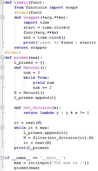 PS:①原primes为迭代器,要想被装饰,修改为函数(通过提前设立max、将yield改为print)