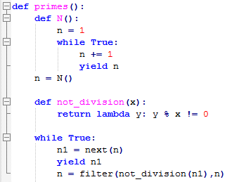 ③ n1 = next(n)获取Iterator的第一个值,返回第一个值后,用filter进行筛选,n中但凡是可以整除n1的都会被删去,包括与n1等值的n的第一个值。