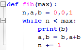 PS:两者的Fib函数没有不同,但这里的fib函数其实是模仿方法①的同行赋值式a,b = b,a+b,设立特殊值(n = 1和n = 2),设立算法的最终输出(n = 3时返回a+b,符合斐波那契数列的定义),通过递减n控制次数,在次数限制下不断对初始的a = 1 , b = 1进行逻辑运算,得到结果