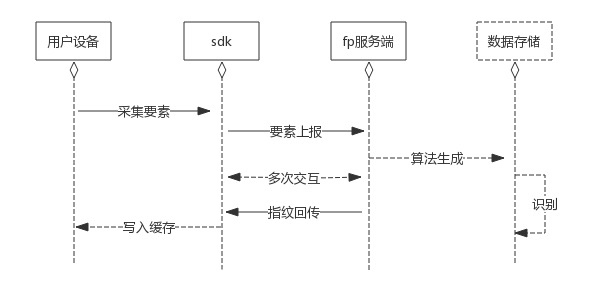 混合式-即既有主动采集部分,又有服务端算法生成部分。通过植入SDK和JS,埋点在固定的业务场景,被动触发时的主动去采集要素,并与服务端交互,通过算法混淆加密后,在服务端生成唯一的设备指纹识ID,同时写入唯一ID存于app应用缓存或浏览器cookie中。一定时间内,用户再次使用对应业务埋点页面时,无需大量重新上传采集要素,只需比对要素变化比例,通过加权比对,计算得出置信度数值,并通过阈值判断是否重新生成设备指纹码。正常用户在使用时理论上是无感知且很少会主动篡改设备指纹唯一ID。