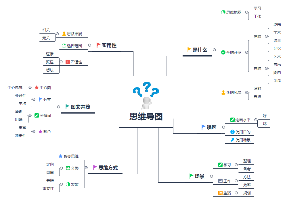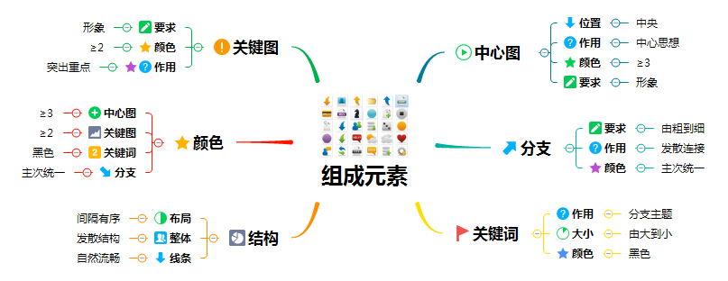 思维导图主要由中心图、分支、关键词、关键图、颜色、结构6要素组成,可以用6个字来概括:心、线、词、像、色、构。