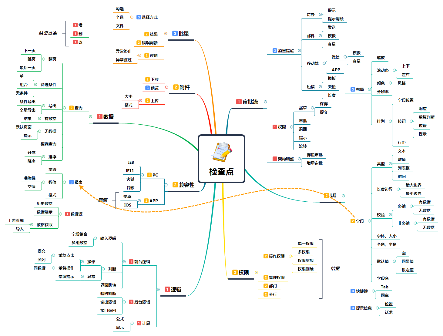 在编写测试用例前,如果已经使用思维导图整理出所有功能点,可以加快测试用例的编写速度,增加编写用例时的逻辑准确性、流程准确性,增加测试用例的覆盖范围。我们的目的是能增加测试前的思考时间,增加思维广度,使用例覆盖尽可能全面,减少用例编写的时间,从而提高质量和效率。同时根据历史经验,可以梳理出通用测试检查点,每次版本根据checklist可以有助于提醒测试人员不遗漏测试点。