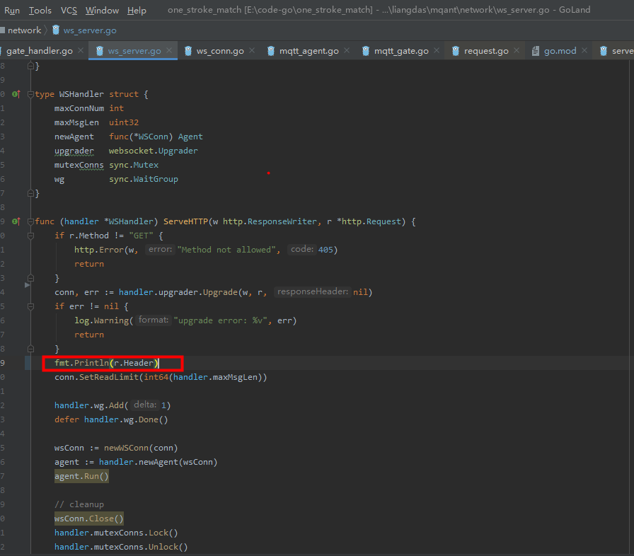 目前使用的是mqant的框架,我们在ws_server.go 里面打印用户建立ws连接前的http请求头