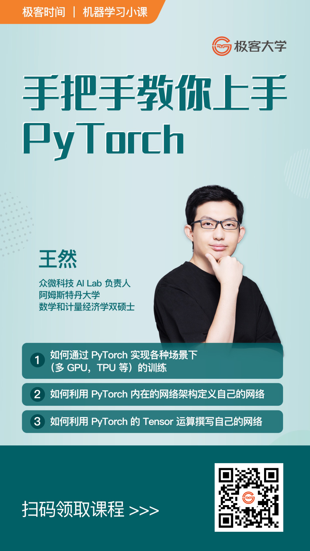 说到这里,不得不推荐极客时间 PyTorch 的小课了,众微科技 AI Lab 负责人王然手把手教你上手 PyTorch。现在还有少量免费学习的名额哦!