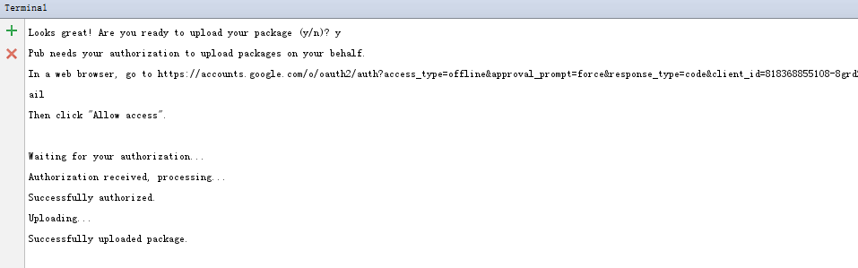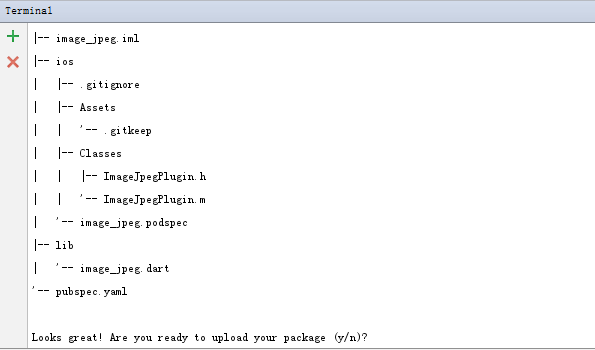 意思就是说,做好插件后,在终端中先执行 $ flutter packages pub publish --dry-run 来检查看是否没有问题了,再执行下一句 $ flutter packages pub publish 来上传。