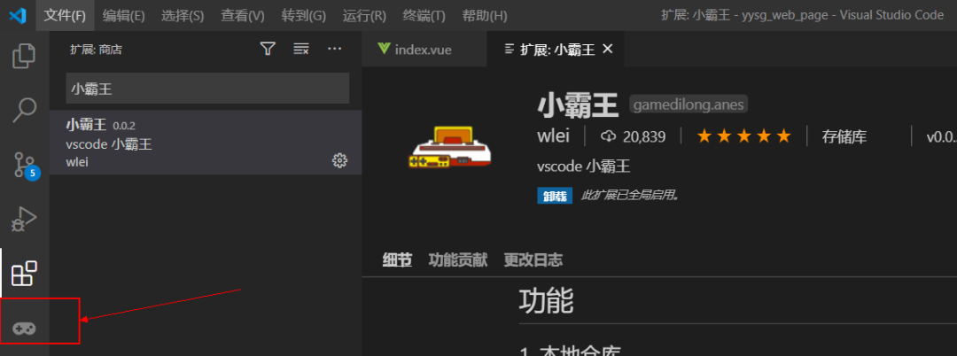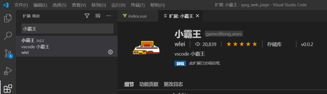 打开vscode,在扩展商店输入小霸王进行搜索,点击右侧的安装按钮,就可以一键安装了。