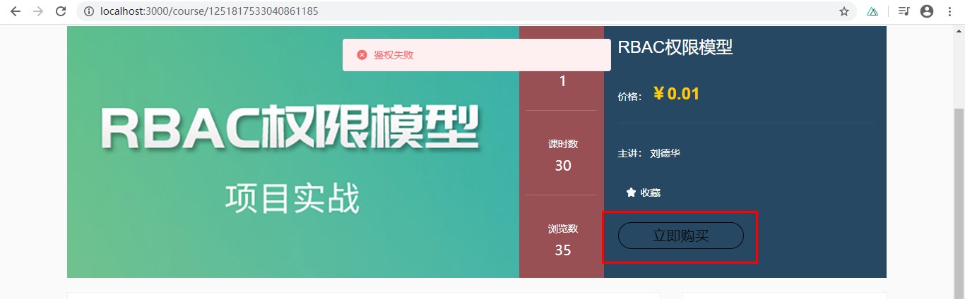 测试:未登录状态下点击立即购买显示“鉴权失败”。