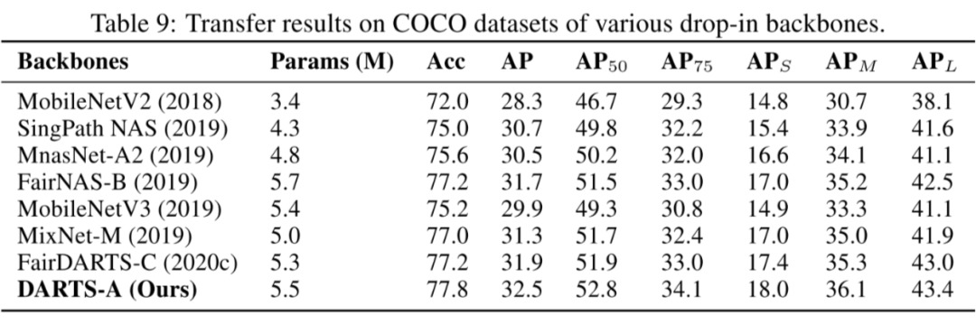 4. 主干网络迁移到检测任务 COCO 的实验结果