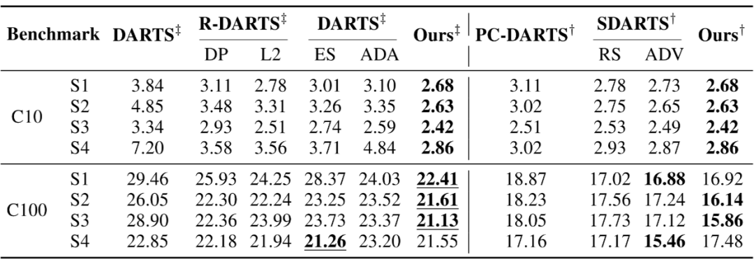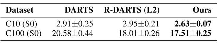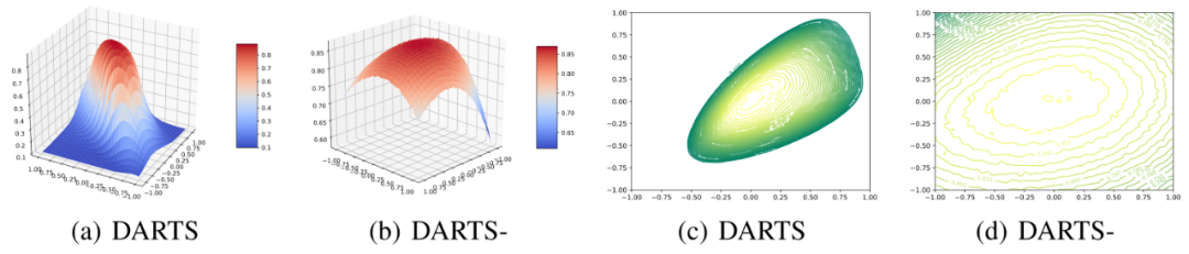 当 β>>βskip 时,λ 就不会对 βskip 那么敏感,此时网络权重 W 将更加依赖于 βconv。因此,结合 PR-DARTS [5] 的分析,可以看出:额外的跳跃连接可以减轻 βskip 的优势并使得架构参数的竞争更加公平。即使 β 逐渐衰减时,由于网络权重 W 已经逐渐收敛,因此依然能保证公平的竞争。综上所述,DARTS- 可以提升 DARTS 搜索阶段的鲁棒性。
