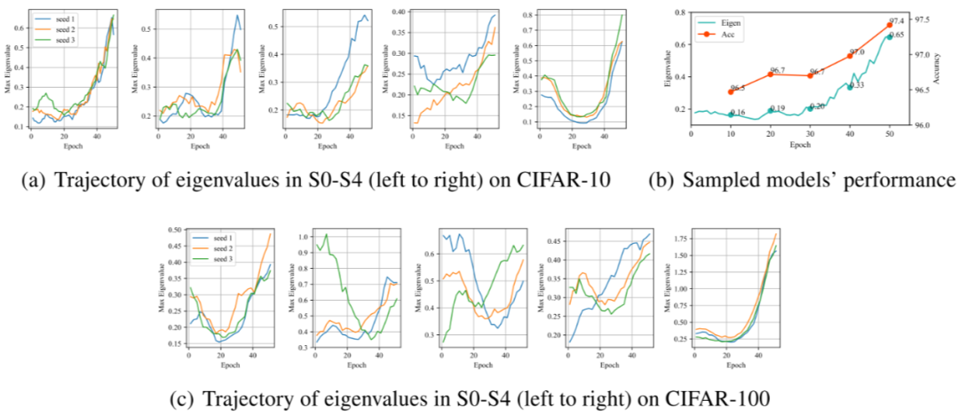 1. DARTS- 搜索过程的特征根:优化过程中特征根(eigvenvalue)的增大,并不一定意味着模型性能会变差。以前方法用特征根作为性能崩塌的指示标志,我们找到了如图的几组反例。