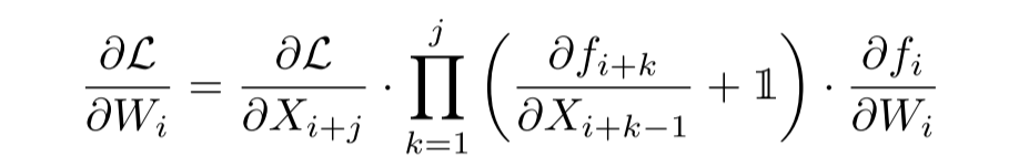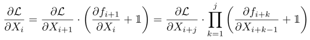可以看出,浅层的梯度总是包含了深层,用公式表示为: