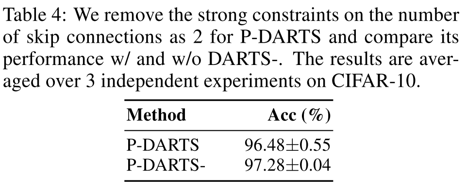 因此可以看出跳跃连接在 DARTS 中扮演了两种角色:稳定超网训练、作为构建最终模型的候选操作。如果能区分 DARTS 搜索过程中跳跃连接的不同角色,那么就可以稳定 DARTS 的搜索过程。