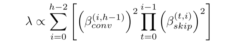 其中 h 表示超网的层数。从上式可以看出,相比于 βconv,λ 更加依赖于 βskip。当引入了额外的跳跃连接后,上式变为: