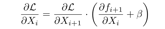为了分析跳跃连接的作用,为所有的跳跃连接引入一个超参数 β,那么 Xi 的导数变为:
