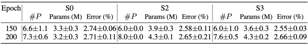 4. 使用更长的搜索轮数:Amended-DARTS [6] 中提到使用更长的搜索轮数能使得超网更充分地收敛。而 DARTS 以及很多 DARTS 方法的变体在使用更长的搜索轮数时,会由于跳跃连接聚集而导致性能崩塌。为了验证该问题,我们将搜索轮数从 50 分别延长至 150 和 200。在 S0、S2 和 S3 三个搜索空间分别进行三次搜索实验,同时设置 β 只在最后 50 个 epoch 衰减。实验结果见下表。可以看出,经过更长的搜索轮数后,并没有出现明显的性能崩塌。我们同时也发现超网的收敛程度和搜索网络的性能之间的关系并不简单,尚待深入分析。