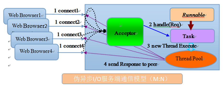 如果要让 BIO 通信模型 能够同时处理多个客户端请求,就必须使用多线程(主要原因是socket.accept()、socket.read()、socket.write() 涉及的三个主要函数都是同步阻塞的),也就是说它在接收到客户端连接请求之后为每个客户端创建一个新的线程进行链路处理,处理完成之后,通过输出流返回应答给客户端,线程销毁。这就是典型的 一请求一应答通信模型 。我们可以设想一下如果这个连接不做任何事情的话就会造成不必要的线程开销,不过可以通过 线程池机制 改善,线程池还可以让线程的创建和回收成本相对较低。使用FixedThreadPool 可以有效的控制了线程的最大数量,保证了系统有限的资源的控制,实现了N(客户端请求数量):M(处理客户端请求的线程数量)的伪异步I/O模型(N 可以远远大于 M),下面一节"伪异步 BIO"中会详细介绍到。