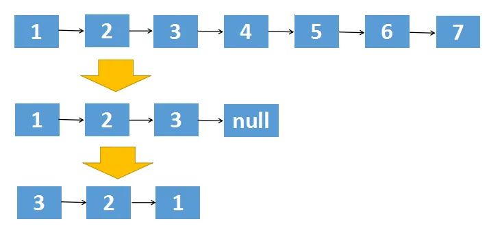 之后我们将长度为k的链表直接交由反转链表函数处理,于是我们就可以得到长度为k的反转链表了。