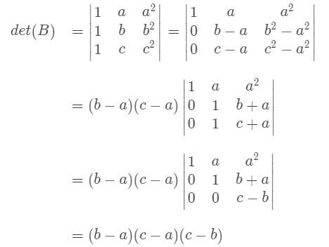 来说第三行减去第二行,第二行减去第一行,于是我们得到第二行和第三行相等,因此行列式为 0对