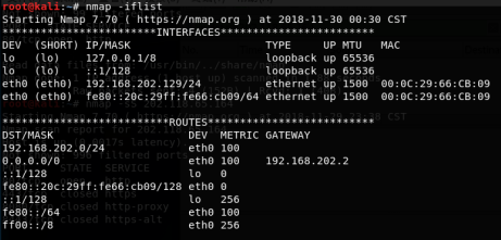 nmap中提供了–iflist选项来查看本地主机的接口信息与路由信息。当遇到无法达到目标主机或想选择从多块网卡中某一特定网卡访问目标主机时,可以查看nmap –iflist中提供的网络接口信息。和route -n功能一样