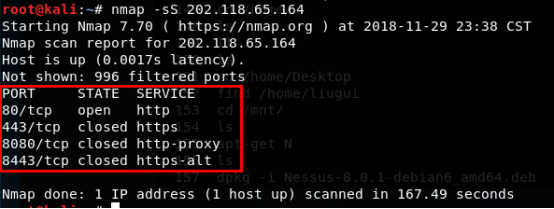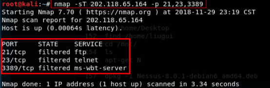 >>>nmap -sT 202.118.65.164 -p 21,23,3389 -p是指定的端口