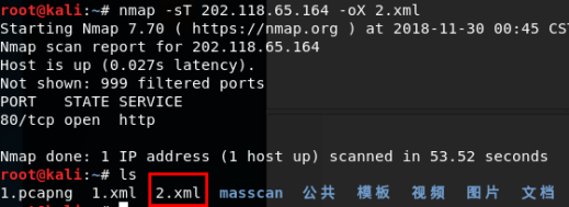 >>>nmap -sT 202.118.65.164 -oX 1.xml