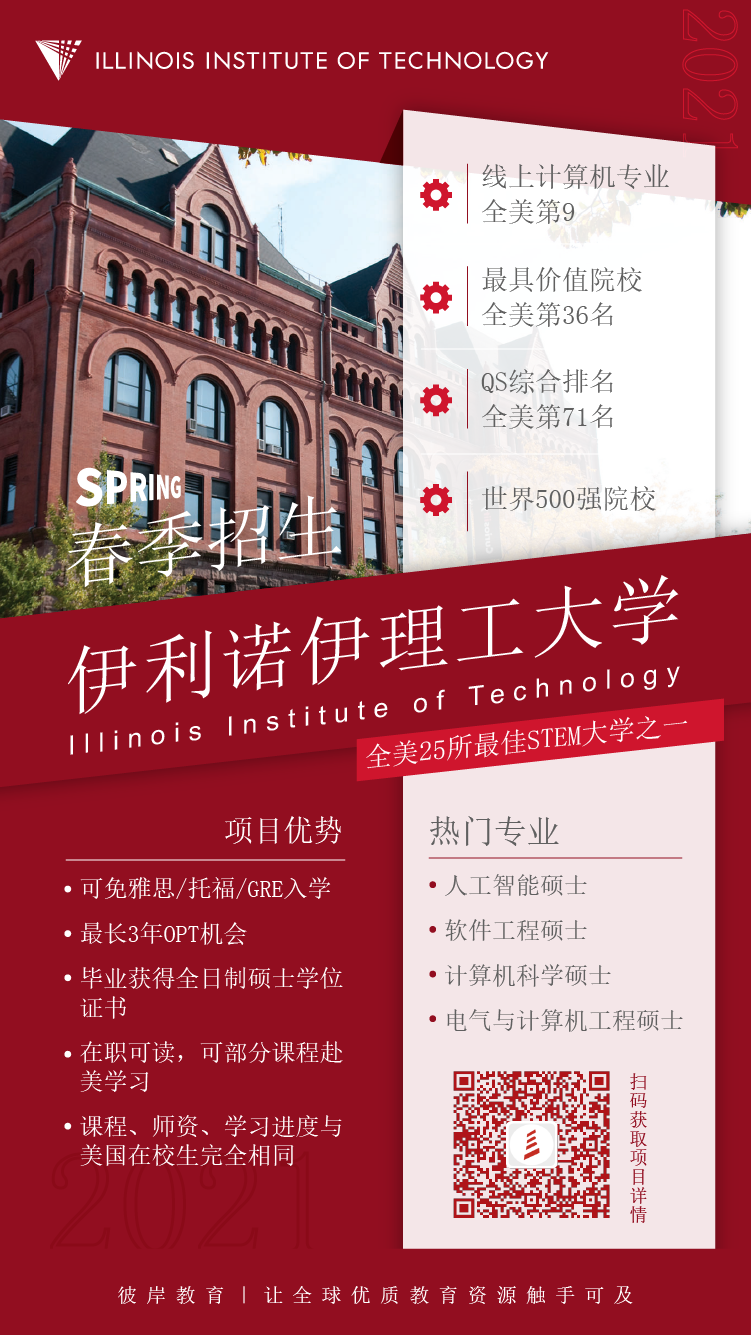 伊利诺伊理工大学(Illinois Institute of Technology,简称IIT),QS2020美国大学排行榜第 71 名,在线计算机硕士项目全美排名第9,是一所百年理工科强校。IIT 和麻省理工大学、加州理工大学、卡内基梅隆大学等 20 所美国顶级工科大学一起组成了美国独立理工大学协会(AITU),现在的成员共有 22 个,IIT 是创始成员之一。