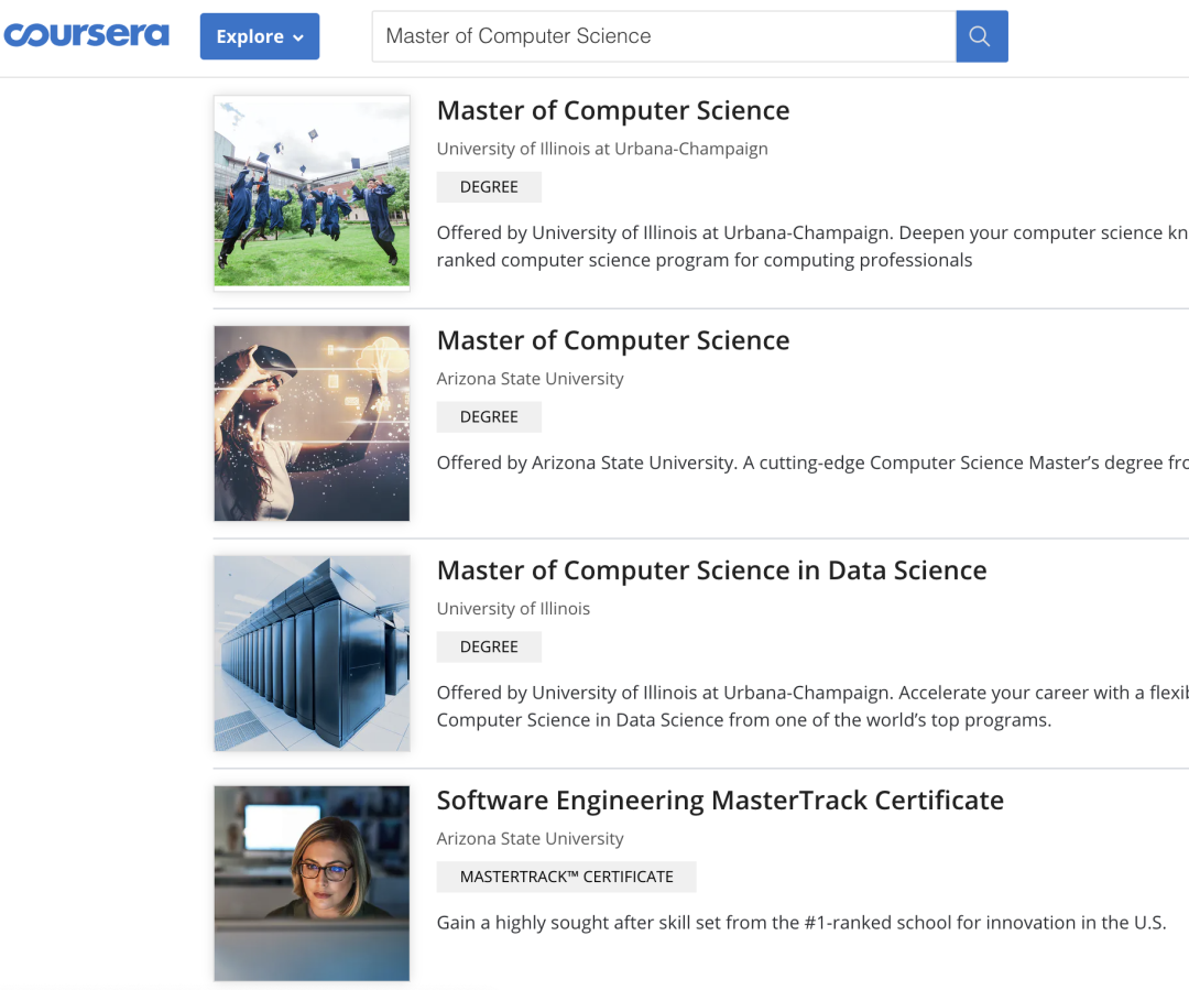 所以今天喵哥想跟大家分享一个通过在线方式读名校硕士项目的信息,在欧美国家线上攻读学位其实还蛮成熟的,认可度也比较高,在国内应该还算新鲜的。我在Coursera上稍微搜下,很多名校都有提供线上进修项目,时长是12到36个月,费用也不太低。
