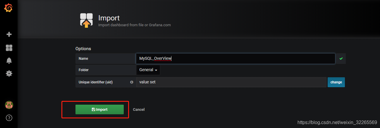选择上传MySQL_Overview.json,设置完成后,单点Import