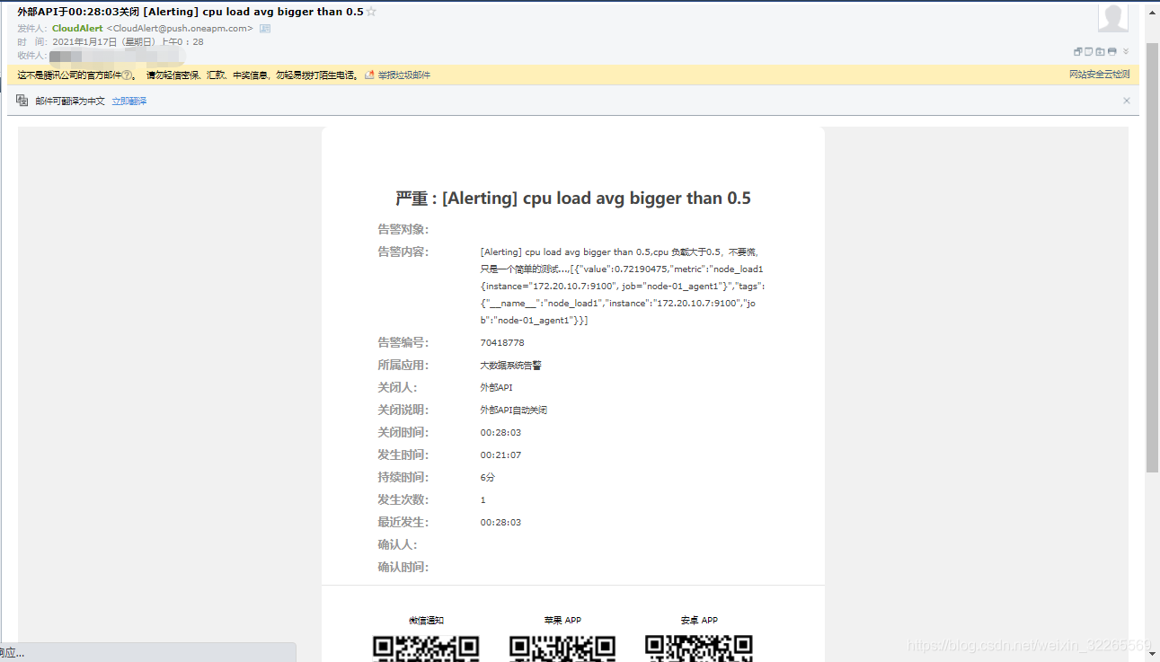 同时,使用手机扫描二维码,也可以详细了解告警信息。