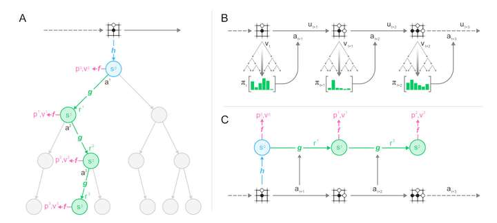 MuZero是一种机器学习算法,因此自然要先了解它是如何使用神经网络的。简单来说,该算法使用了AlphaGo和AlphaZero的策略网络和值网络: