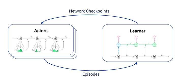 一个学习者接收最新轨迹,将最新轨迹保存在重播缓冲区,并根据这些轨迹进行上述训练;