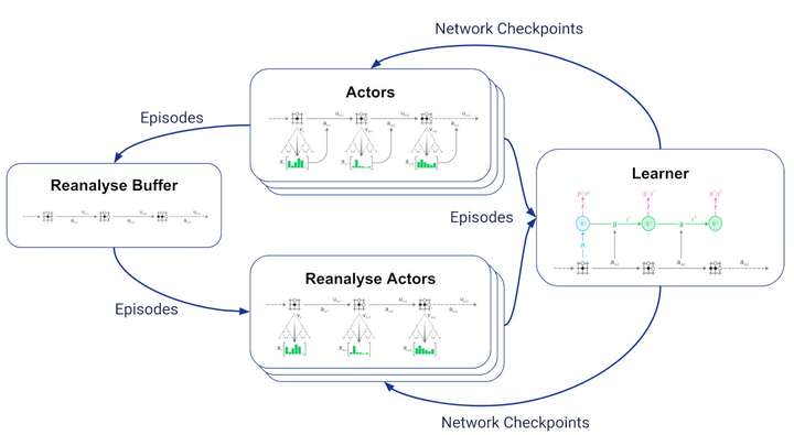 多个重分析行动者从重分析缓冲区采样存储的轨迹,使用学习者的最新网络检查点重新运行MCTS,并将生成的轨迹和更新的统计信息发送给学习者。