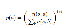动作的选择可以是贪心的(选择访问次数最多的动作),也可以是探索性的:通过一定的温度t控制探索程度,并对与访问次数n(s,a)成比例的动作a进行采样: