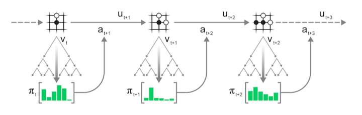 - 根据搜索的统计信息πt选择一个动作a(t+1);