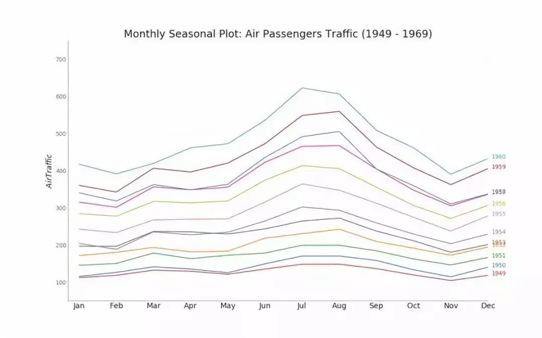 时间序列图用于显示给定度量随时间变化的方式。在这里,您可以看到 1949 年 至 1969 年间航空客运量的变化情况。