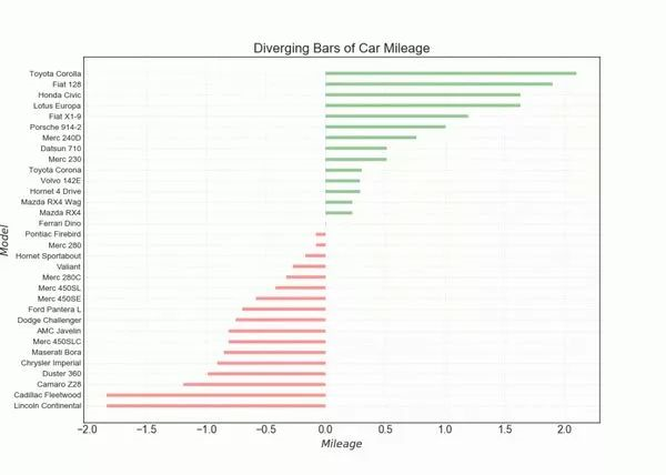 如果您想根据单个指标查看项目的变化情况,并可视化此差异的顺序和数量,那么散型条形图(Diverging Bars)是一个很好的工具。它有助于快速区分数据中组的性能,并且非常直观,并且可以立即传达这一点。