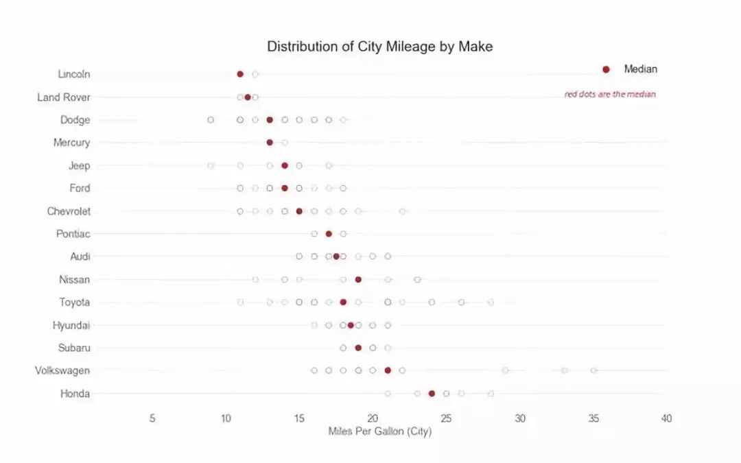 包点图表传达了项目的排名顺序,并且由于它沿水平轴对齐,因此您可以更容易地看到点彼此之间的距离。