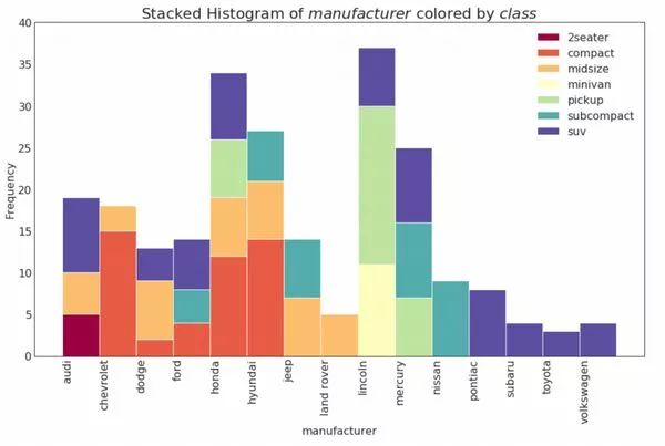 类型变量的直方图显示该变量的频率分布。通过对条形图进行着色,可以将分布与表示颜色的另一个类型变量相关联。