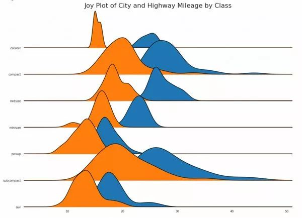 Joy Plot 允许不同组的密度曲线重叠,这是一种可视化大量分组数据的彼此关系分布的好方法。它看起来很悦目,并清楚地传达了正确的信息。它可以使用基于 matplotlib 的 joypy 包轻松构建。