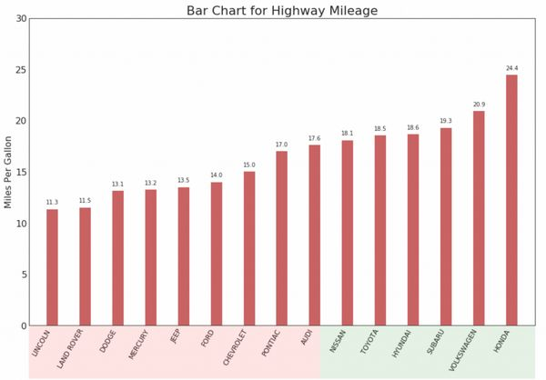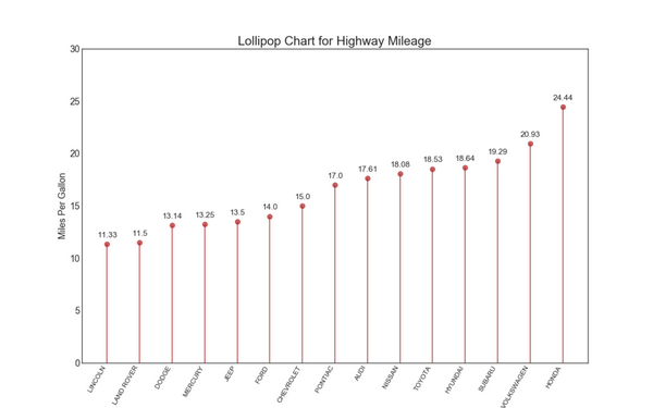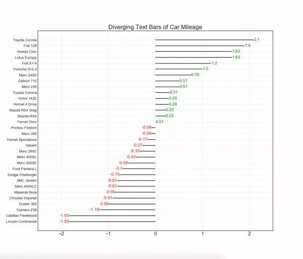 发散型文本(Diverging Texts)与发散型条形图(Diverging Bars)相似,如果你想以一种漂亮和可呈现的方式显示图表中每个项目的价值,就可以使用这种方法。
