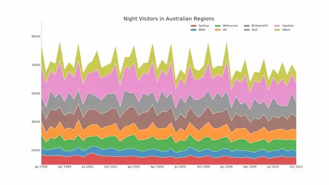 堆积面积图可以直观地显示多个时间序列的贡献程度,因此很容易相互比较。
