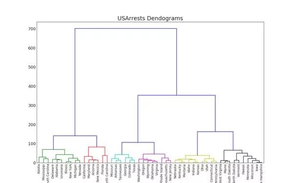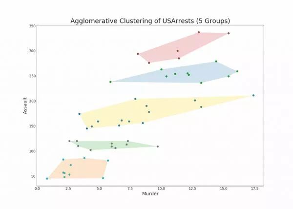 簇状图(Cluster Plot)可用于划分属于同一群集的点。下面是根据 USArrests 数据集将美国各州分为 5 组的代表性示例。此图使用“谋杀”和“攻击”列作为 X 和 Y 轴。或者,您可以将第一个到主要组件用作 X 轴和 Y 轴。