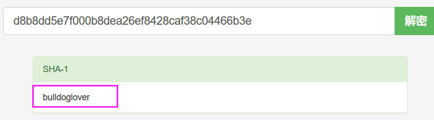 - 对hash进行碰撞,hash长度为40位,可以看出是sha1,即使不知道是哪种hash,也可以把每个hash值,到CMD5尝试碰撞解密: