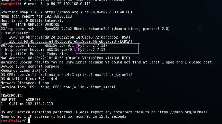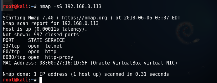执行命令 nmap -A -p 80,23 192.168.0.113 对23和80进行详细探测