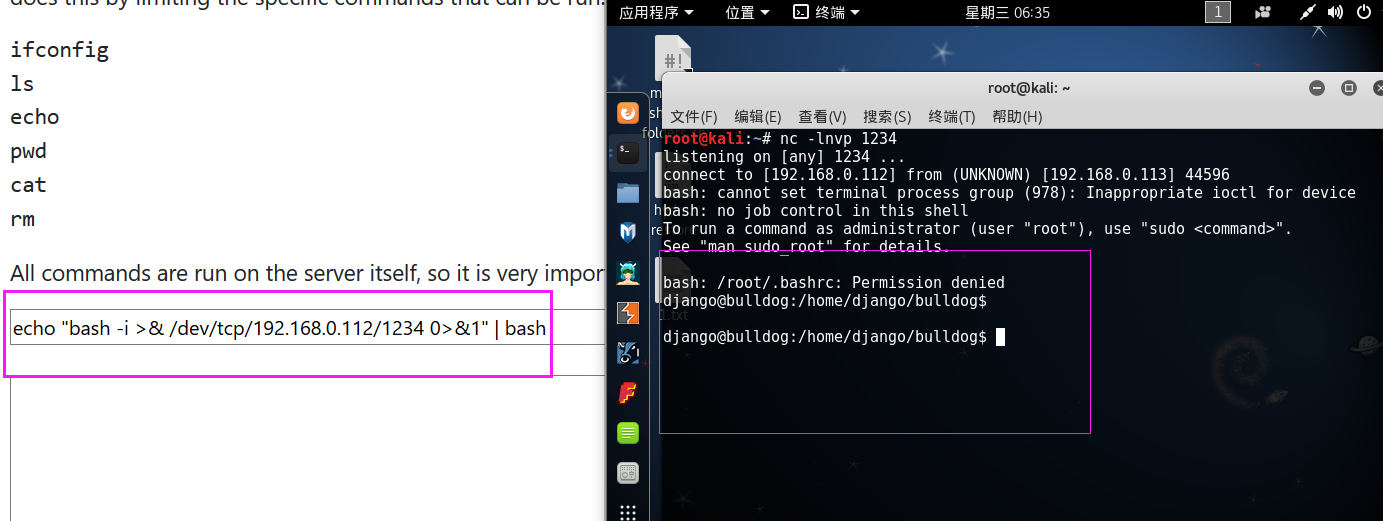(3) 尝试多次bash反弹,最后使用echo命令先输出命令,再输入到bash,反弹shell成功: