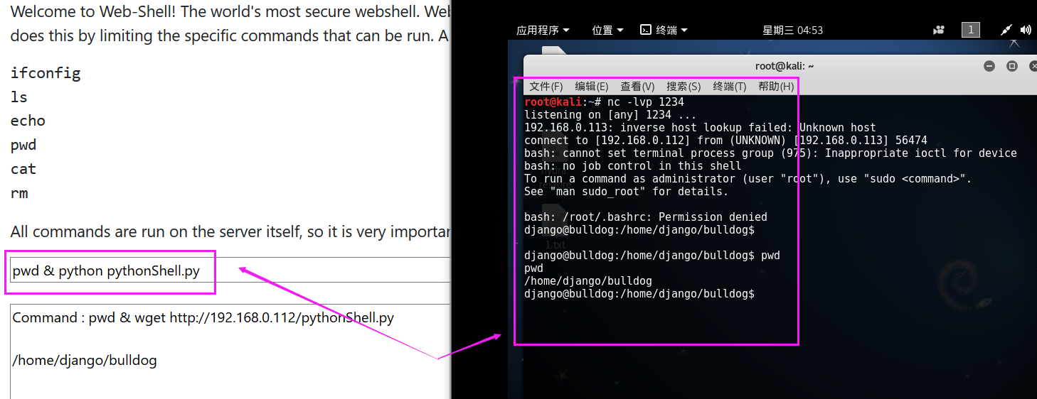 - python反弹shell 可以进行命令注入,尝试wget是否有权限。攻击机kali执行命令